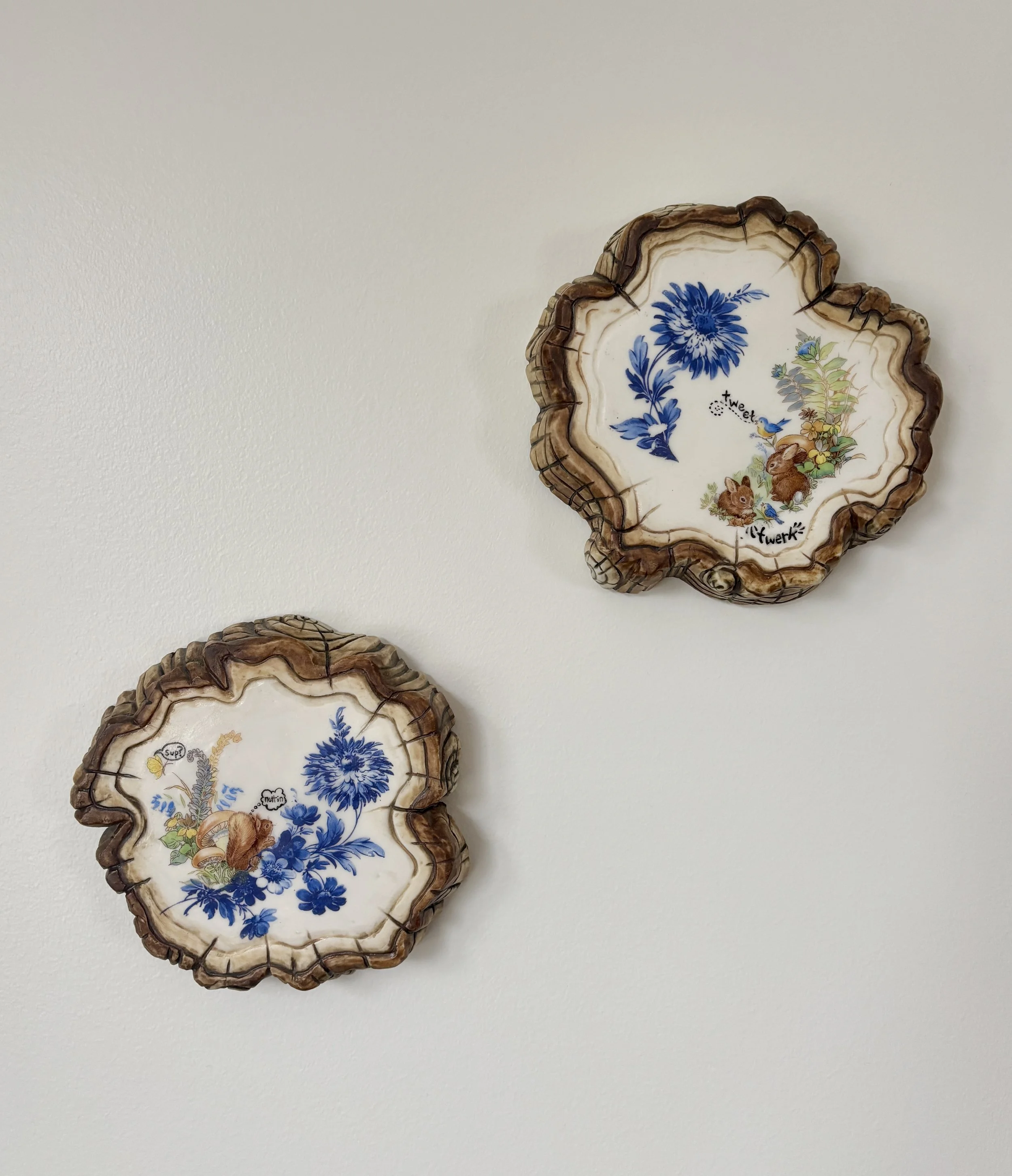 Wildlife Souvenir brings together ceramic sculptures, paintings, and drawings that reimagine nostalgic keepsakes;transforming souvenir plates, figurines, and familiar decorative objects into imaginative scenes that question our relationship with the natural world.